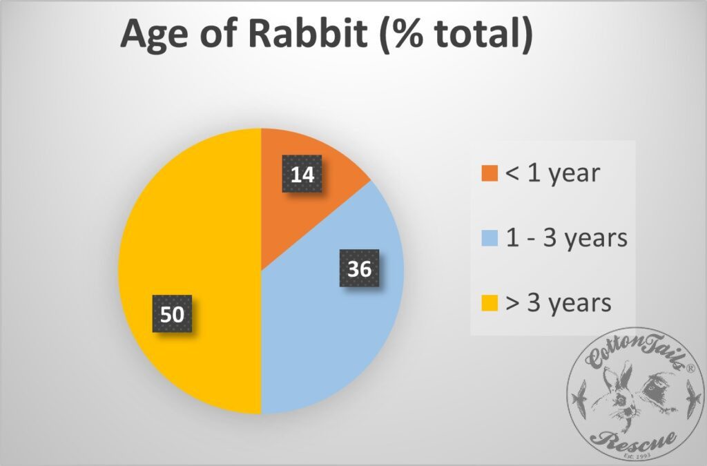 For the third year running, since we started in 1993, the age category with the highest intake at 50% was 3 years or more. Next was 36% for 1-3 years, and 14% under 1 year old. The youngest rabbit rehomed was 6 months old, and the oldest was 8 years old.