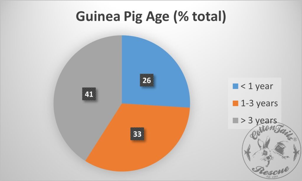 For the first time in many years, the most common age group for rehoming was over 3 years old (41%). 1-3 years accounted for 33%, and the remaining 26% were under 1 year old. The youngest guinea pig requiring rehoming was 5 months old, and the oldest was 6 years old.