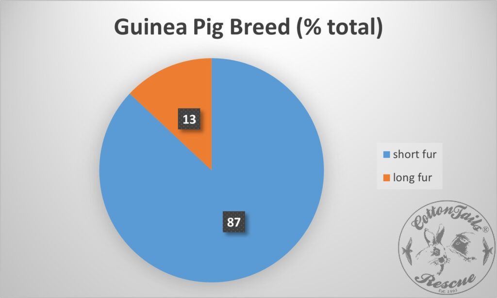As in previous years, the majority (87%) of guinea pigs rehomed were short-haired, with the remaining 13% being either long-haired or semi-long-haired. This may reflect owners’ preference for avoiding a long-haired pet that is perceived (rightly) to be more challenging to keep clean and healthy, and undoubtedly also influences an owner’s decision to put their pet up for adoption.