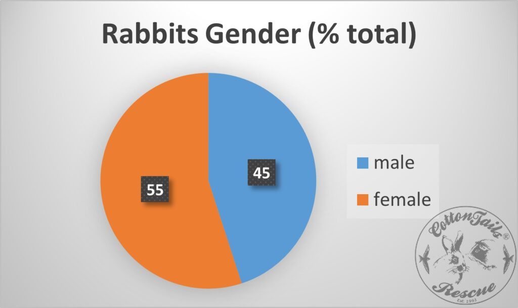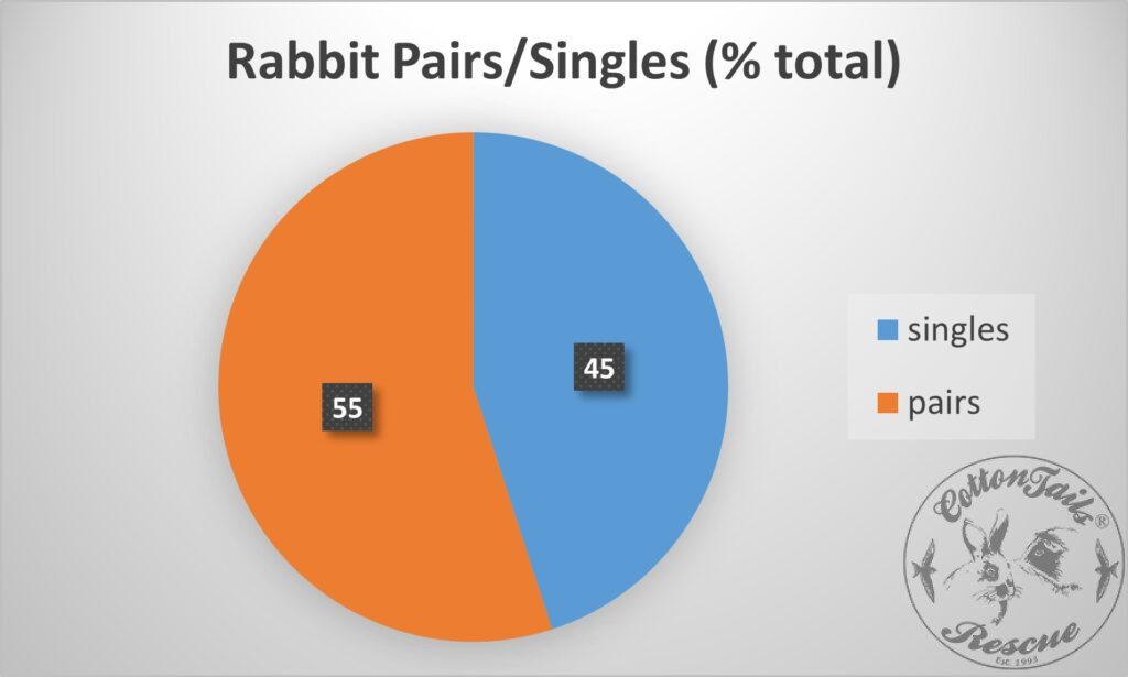 55% of the rabbits rehomed were already in bonded pairs, compared to 45% as singles. Again, this may well be explained by the type of owner using the service, who may be more aware of the importance of most rabbits having company.